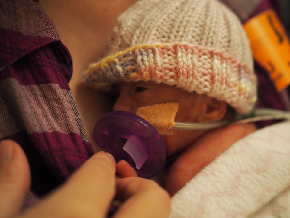 In the coming weeks, she’ll have to learn how to suck, swallow, and breath together. Until then, a tiny tube takes her meals straight to her stomach.